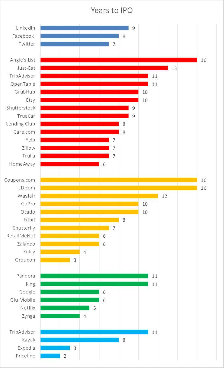 社交类巨头公司平均花费8年的时间,它们都是大型的IPO,如果它们有意愿的话还可以更早上市。市场交易类型的公司上市的平均时间最长,约为9年。很多市场类型的公司需要花费很长时间才能迅速发展,在发展过程中缺少资金支持。电子商务公司之间的差异较大,有些在线零售公司上市需要花费10年以上的时间,而 Zulily 和Groupon 则在短短3、4年就上市了。数字媒体/游戏与电子商务类似,由于一些重大的公司在八十年代和九十年代上市,这张图表中没有列举出来。如果按照我的标准,旅游行业几乎是荒芜的,因为Expedia 和 Priceline 都是在1999年上市的,TripAdvisor 是一家科技公司,是从Expedia(我归在市场交易类)拆分出来的一家公司。
