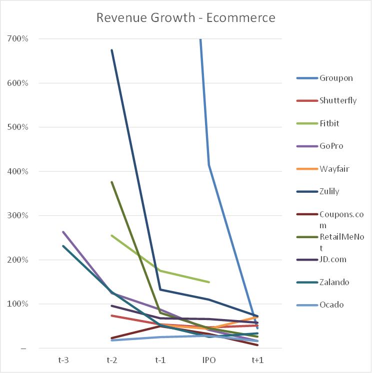 电子商务公司是收入增长最快的领域。Groupon 在2009年的收入是1500万美元,2010年上升至3.13亿美元,2011年收入却高达16亿美元。这是2058% 和415%的增长。Zulily 在 IPO 之前的两年内收入增长高达674%,FitBit 创立几年收入就高达10亿美元。 RetailMeNot、GoPro 和 Zalando 也是同样的情况。从本质上说,公开市场的投资人很难评估这些公司的价值,而这些公司的股票价格像过山车一样不定。