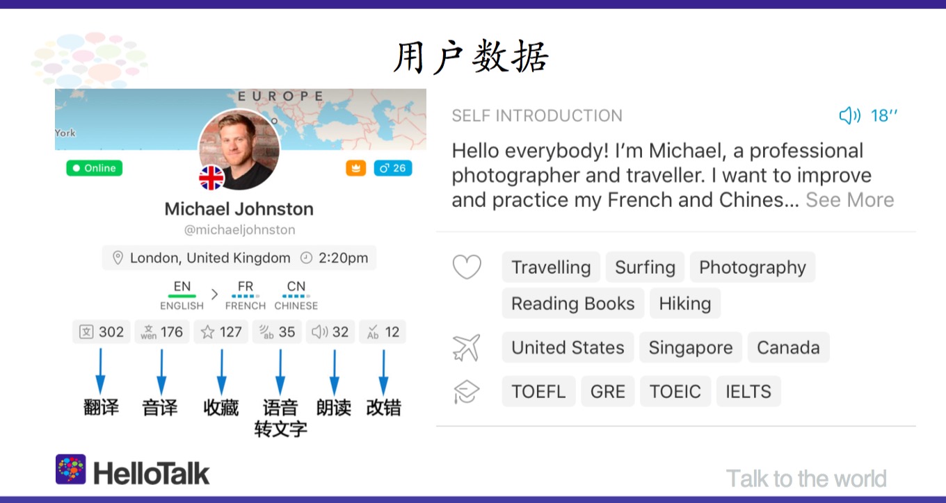 对产品来说,最大的价值就是数据。魏立华表示,hellotalk 目前每天能产生 400 万条消息,其中 10% 会被翻译出来,另外还会产生 3 万条改错信息,这些有意义的数据库可以改变数据引擎的搜索结果,从大数据到人工智能可以更好地帮助中国修正英语发音。