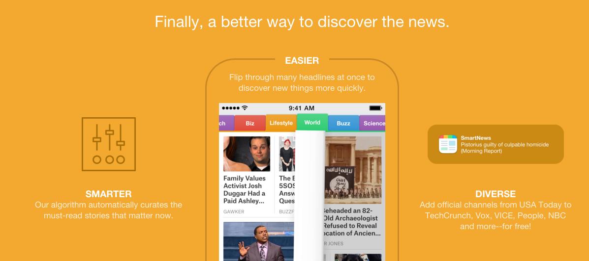 目前市场上已经有很多新闻聚合和发现类的应用和平台了,其中包括Facebook、Flipboard、Apple News、Nuzzel、Quibb和Owler等等。SmartNews的联合创始人Kaisei Hamamoto表示,SmartNews与上述这些公司的不同之处在于,SmartNews推送的所有新闻是彻底基于推荐算法推荐的,而其它新闻聚合产品所推荐的新闻都有深深的人为参与筛选的痕迹。这也是为什么Hamamoto称自己为‘首席记者’而非‘主编’的原因所在。“如果我称自己为主编的话,那意味着我自己会参与编辑筛选。而现在我的头衔是首席记者,我的工作就不是去筛选故事和内容,而是与工程师合作去识别算法,让推荐算法变得更加智能,从而为读者推荐他们喜欢的新闻。”Hamamoto这样说道。