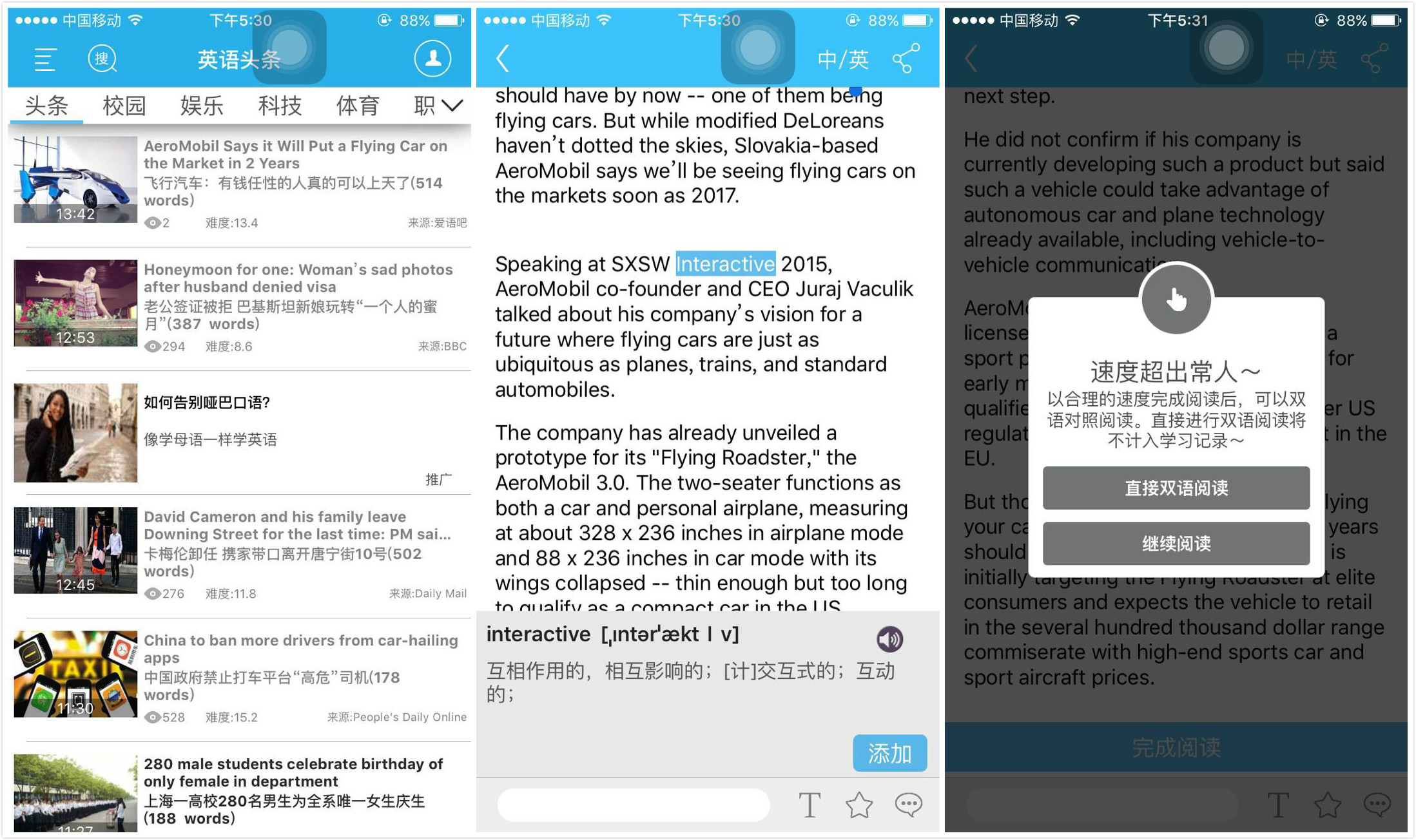 单纯的阅读无法并不能直接达到英语学习的目标,关键是如何开发这些内容。英语头条想做的事情是满足不同阶段的用户阅读水平,但是系统没有统一测评,需要用户手动设置阅读难度(从小学到专四、专八、商务英语不等),系统会根据每篇文章的阅读时间来判断用户的掌握情况。