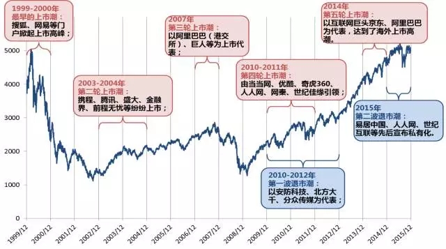 迄今为止,中国互联网企业曾出现过几次大的境外上市浪潮(见下图)。对于国内互联网企业上市为何涌向美国?较为普遍的认识是由当时的历史原因造成的。上世纪90年代,中国的资本市场以核准制为主导,具有硬性的上市门槛和审核标准,而互联网企业基本没有盈利,很难在国内实现上市。而美国市场则不同,不仅上市门槛低,没有盈利性要求,而且资本市场制度完善,上市速度快,为国内互联网企业打开了上市的便捷之门。