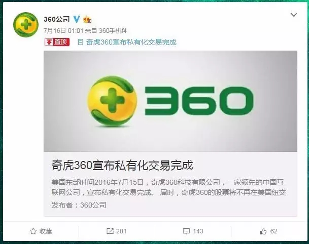 2015年6月,奇虎360宣布私有化。2016年7月16日凌晨,奇虎360对外宣布私有化交易完成。今日,奇虎360的股票也已停止在美国纽交所公开交易。原本预计私有化交易于2016年8月中旬前完成,如今比预计时间提前了一个月。当前360已经同时启动回归A股的部分工作。