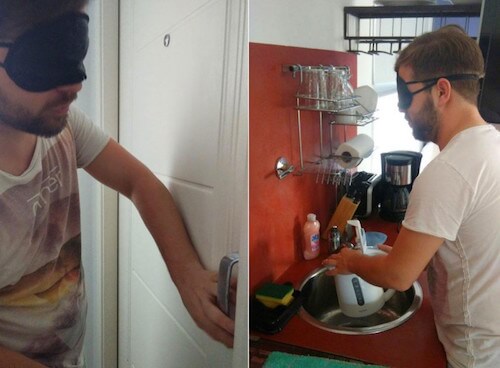 但是我们要想简单一点!你可以用30分钟规划想法并作出原型,这个过程更不需要视力受损者参与测试。在一次原型开发的实践中,我们用一个非常简单的产品原型进行了实验:我们给一位团队成员蒙上了眼睛,然后用在他的腰部敲击这种办法来模拟腰带的振动。这种简单到离谱的做法让我们进行了产品创意最基本的初始测试然后马上收到了反馈。