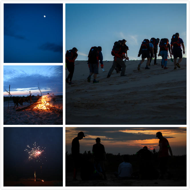 你会发现,没有人会去想被没收的手机,没有人去问现在几点,一切回归原始,疲惫地坐在火堆边烤衣服、闲聊,偶尔安静下来听大自然中一切生物的美妙发声,临睡前抬头看看满天繁星,安心于外面有守夜的队友,实在太累也实在拍不干净身上的沙就这样钻进帐篷沉沉入睡……那一天,再也没有每天时常涌现的焦虑,没有投资,没有创业。