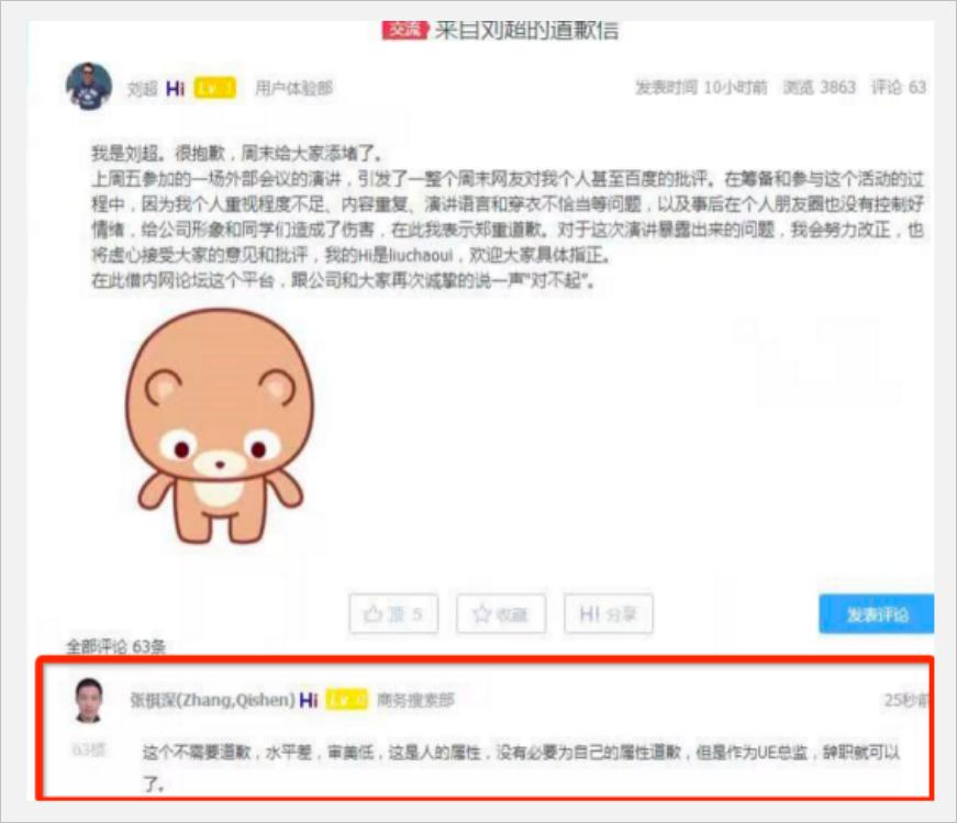 (图为刘超道歉信,百度某员工回复到:“这个不需要道歉,水平差,审美低,这是人的属性,没有必要为自己的属性道歉。但是作为UE总监,辞职就可以了。)