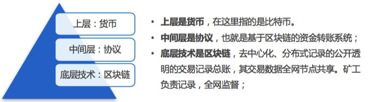 谈到区块链,必然先想到比特币。从技术角度来看,比特币的系统包括三层:底层技术——区块链;中层链接——协议;上层——货币。