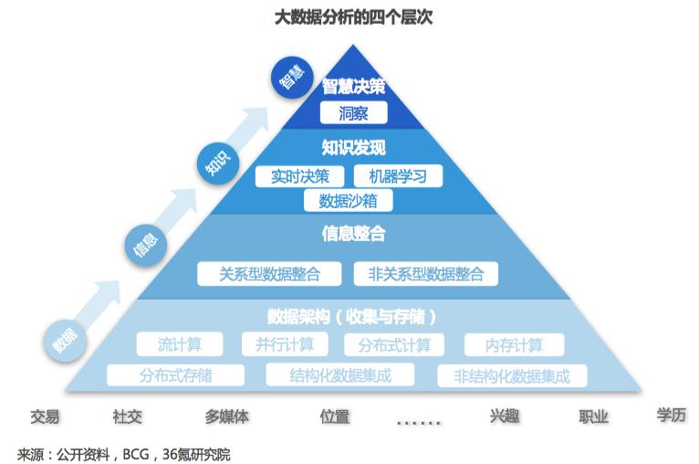 若将大数据分析分为四个层次,在FinTech1.0阶段,大数据技术的主要应用是集中于第一和第二层次,即数据架构和信息整合;初步进入第三层次,进行简单的初步分析和决策。