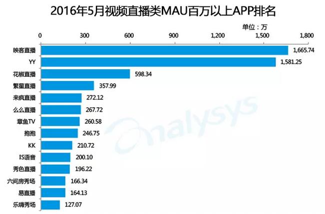 易观智库2016年5月视频直播app调研,映客MAU排名第一