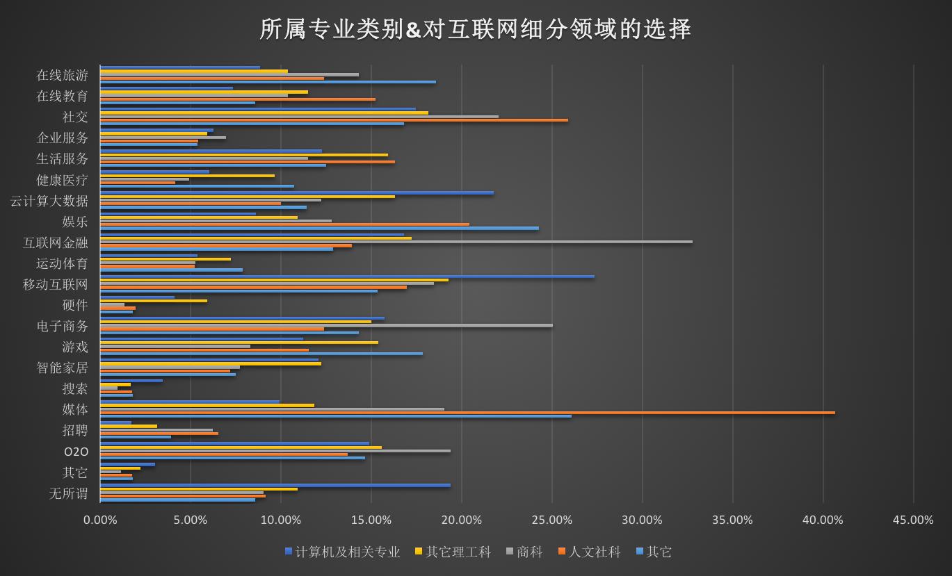 相对来说,其他理工科专业的同学并没有特别明显的选择倾向。人文社科专业的同学们在就业的选择上更青睐媒体、社交类互联网公司,而商科类专业的同学们有30%以上则倾向于选择在互联网金融领域大展拳脚。