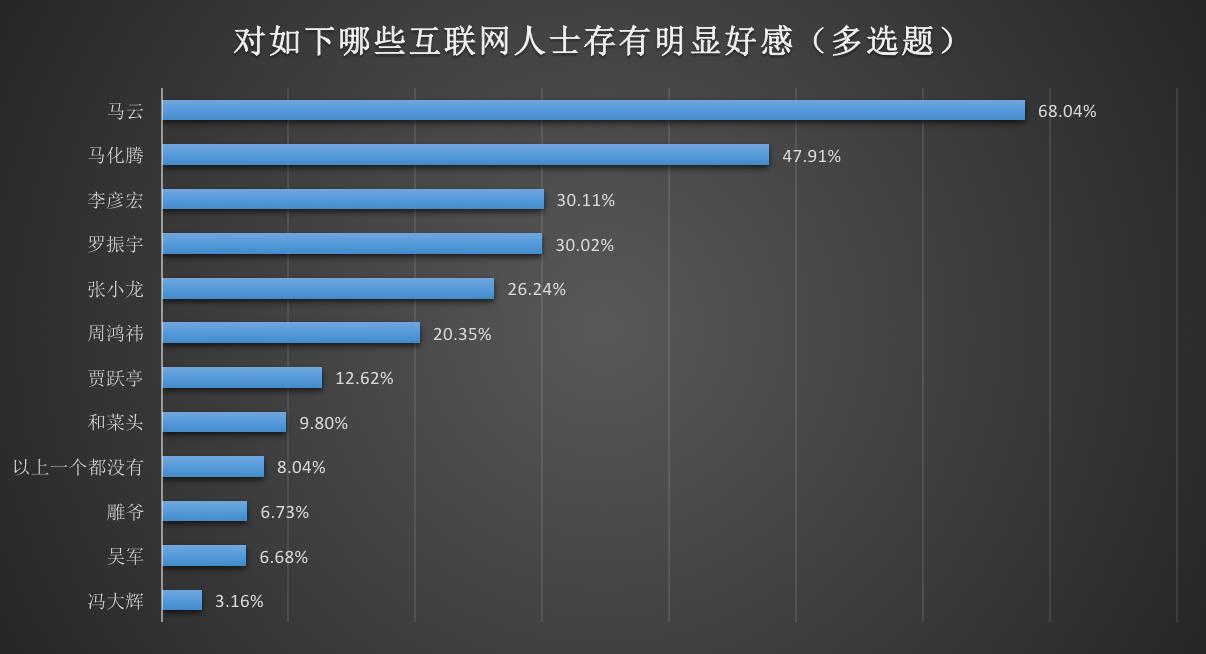 我们发现,在我们所给出的一些互联网一线名人和大佬中间,大学生普遍对马云、马化腾、李彦宏、罗振宇、张小龙存有明显好感,其中,马云爸爸最受大学生的欢迎,赢得的好感度选票达到了68.04%,可谓是一枝独秀。