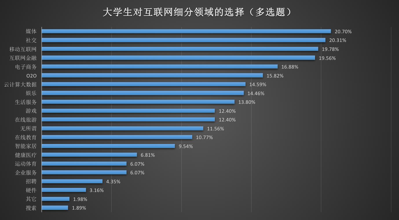 在对于互联网细分领域的兴趣度方面,媒体(20.7%)、社交(20.31%)、移动互联网(19.78%)、互联网金融(19.56%)、电子商务(16.88%)等几个领域更受大学生的青睐。