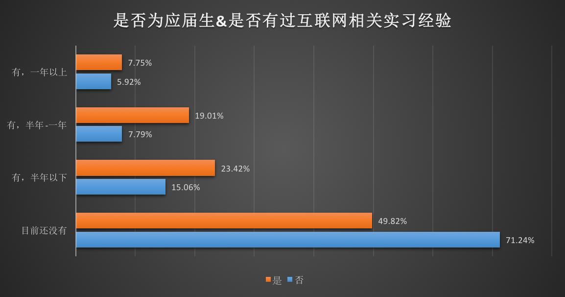 看起来,对比起他们的“兴趣”和“求职意愿”来看,大学生对于“实习”的重要性意识还是比较薄弱的。对大学生的就业来说,这不是件好事。至少,我们认为大部分完全没有相关经验的大学生是很难顺利进入互联网行业工作的。