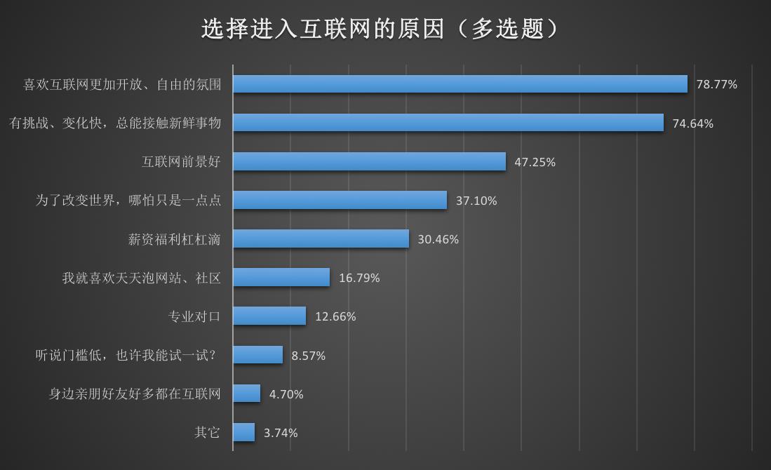 此外,觉得互联网“前景好”、“钱景好”和“为了改变世界,哪怕一点点”这三个选项的排名也位居前列。