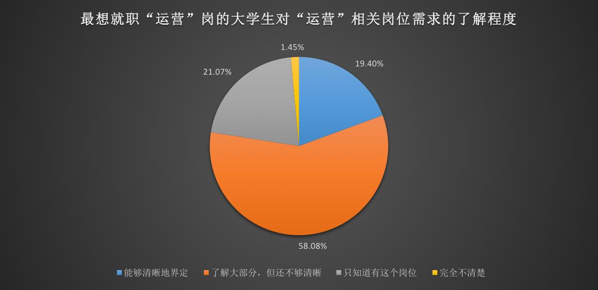 在对于“运营”这个岗位的了解程度上。虽然有39%的大学生表示最想就职的互联网岗位类别是运营,但其中能清晰界定“运营”是什么的仅占19.4%,而“只知道有这个岗位”的大学生则占比21.07%。