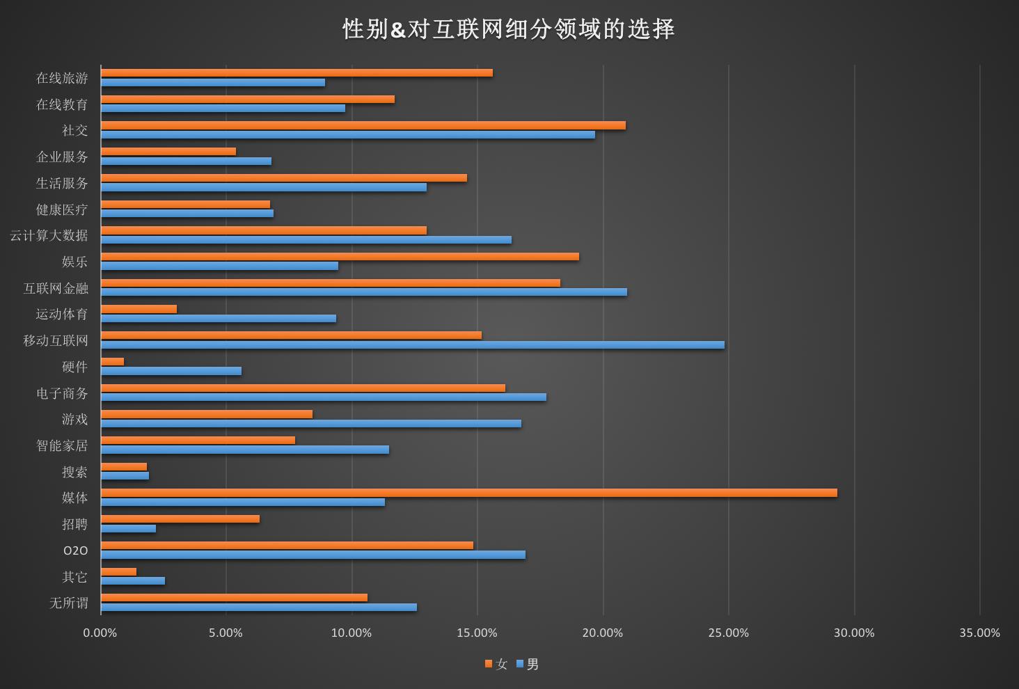 对于媒体、在线旅游、娱乐这三个方向表示感兴趣的女生占比要比同样感兴趣的男生占比高出了至少三分之一。其中以“媒体”领域为甚,对于进入媒体方向就业感兴趣的女生要比同样对此方向感兴趣的男生多了不止一倍!