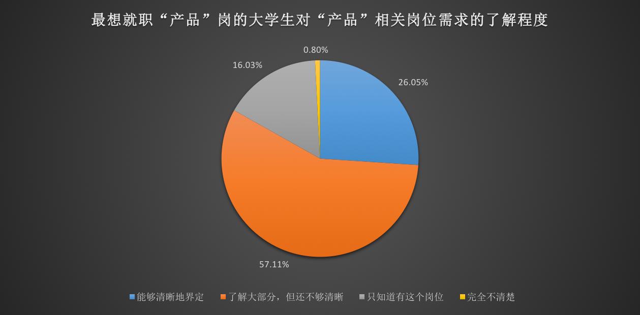 虽然有22%的大学生表示最想就职的互联网岗位类别是产品,但在这22%的大学生中,仅有26.05%的大学生能够清晰界定“产品经理”相关岗位的具体工作职责和工作要求,有16.03%的大学生表示“只知道有这个岗位”而已。