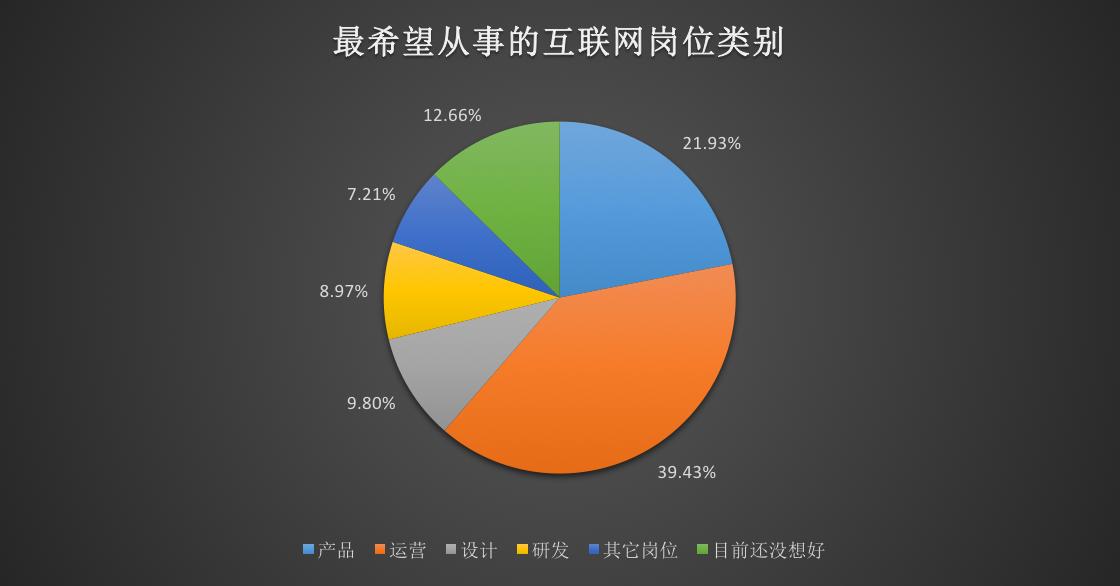 众所周知,在此前3-5年的时间里,因为《人人都是产品经理》等书籍,加上乔布斯、张小龙等人带来的偶像崇拜效应,“产品经理”一直是最受大学生青睐的互联网岗位。但有趣的是,我们发现到了今年,这一态势正在悄然发生着变化——在本次调查中,我们发现大学生最希望从事的互联网岗位已经悄悄变成了“运营”,有多达39.43%的大学生选择了此项。而后才是“产品”岗,有21.93%的大学生表示自己最想从事的岗位是它。