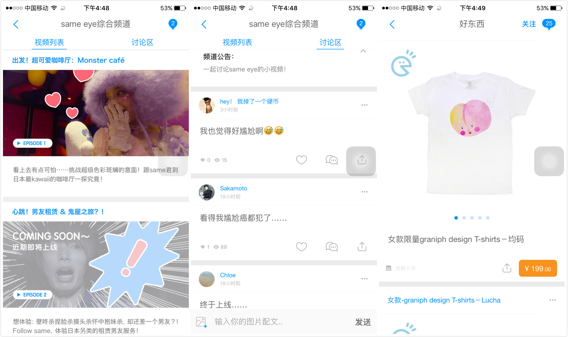 但我看完了第一期的 same eye 视频内容后,没有留下太深刻的印象。主持人带逛的形式比较常见,关于日本咖啡馆的介绍性内容对我来说也不是太有价值。不过 same 的用户是 90后、 95 后居多,话题对不对味,还得看用户的反馈。我在 same eye 频道内看了一下,用户评价并不过,前几天都是说节目有点“尴尬”。但一个社区 App 团队新组建一个视频内容团队,还是需要时间测验选题和形式的。