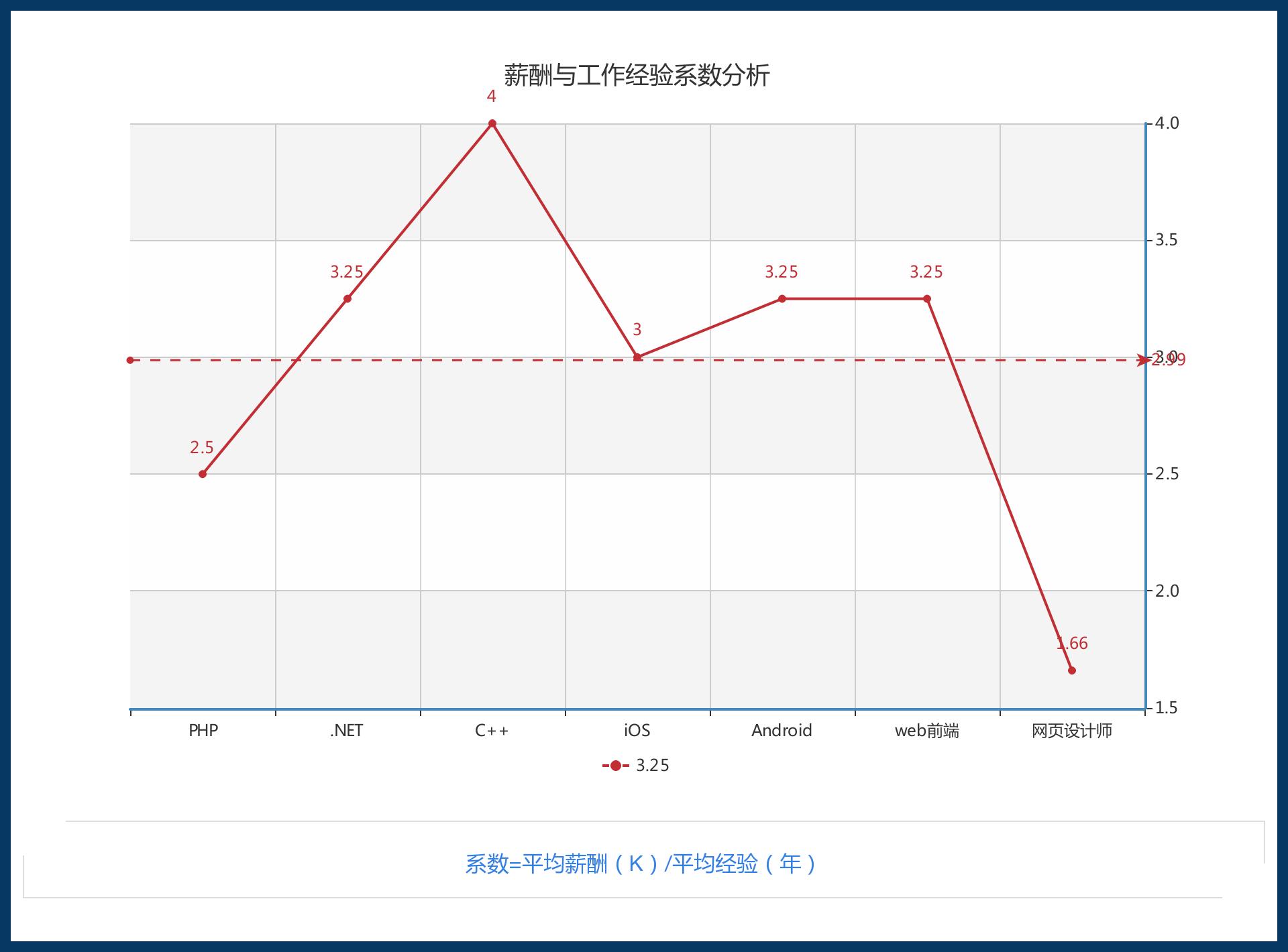 分析统计结果,“3”作为中位值和参考量,在8大技术岗位中,PHP/网页设计师这两类岗位的“性价比”在今年上班年成交的offer数据中得分系数偏低,换而言之,一个3年工作经验和一个5年工作经验的PHP程序员薪资差异要低于同样一个一个3年工作经验和一个5年工作经验的JAVA程序员。