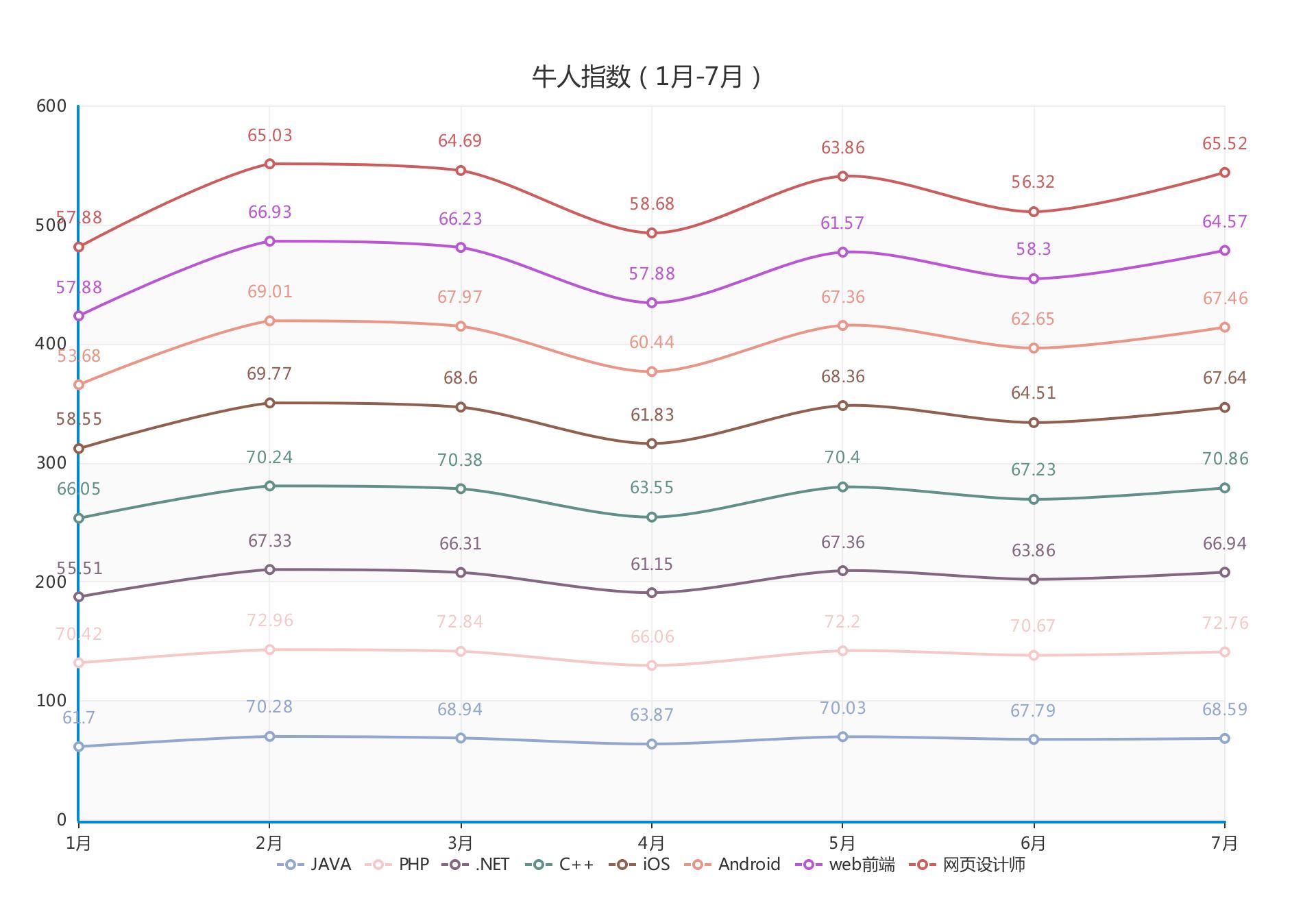 通过对JAVA、PHP、.NET、C++、iOS、Android、WEB前端、网页设计8大岗位在今年1-7月中的牛人指数分析,可以得到一些观点:
