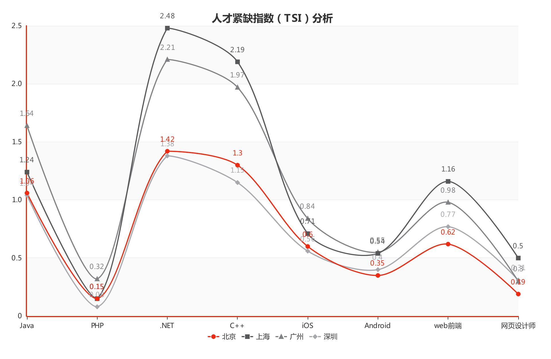 通过上表,可直观发现.NET、C++、JAVA这三类职位是上半年的北上广深四城技术岗位中较为紧缺的,而PHP、网页设计、安卓/IOS职位则明显供过于求。