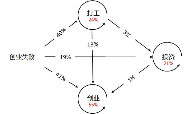 在失败后直接选择创业的人一开始只有41%,但是通过做投资和打工短暂调整后,又有14%的创业者接着再创业,将比例提升到55%
