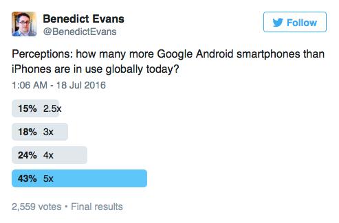 上周,我在Twitter上发起了一个并不完全科学的民意调查,让大家猜测如今全球范围内使用 Google 安卓手机的数量是 iPhone 的多少倍,得到了以下结果: