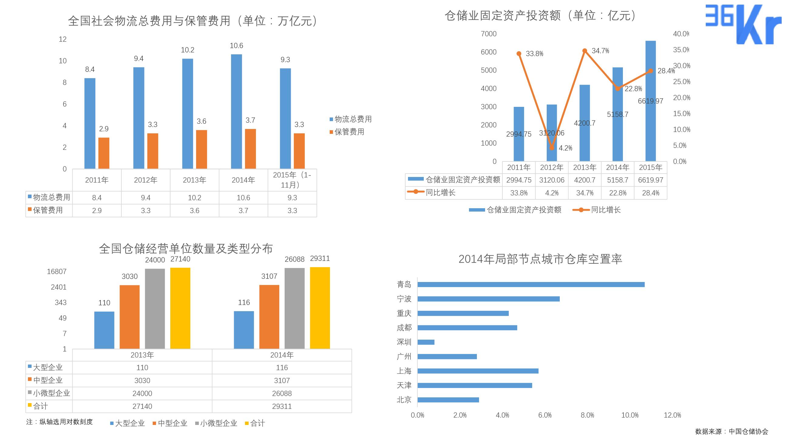 仓储目前利润低、发展不平衡,北京成本为0.4-0.6元,实际出租价格1.0-1.2元,二三线城市成本不变,租赁价格偏低、出租率低,利润空间小。