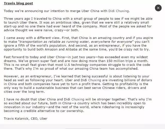 “你知道滴滴和Uber合并了吗?”下午6点,36kr记者打上了一辆棕色的马自达,询问司机时,对方露出了一脸懵住、不敢相信的表情。今天下午5点,在经历了两周的反复传言和辟谣——先是由彭博等海外媒体传言双方在商谈、由滴滴副总裁、投资人和公关部门出面否认、Uber中国副总裁柳甄否认,再出现已经合并的传言,并传出Uber创始人发的合并通知邮件,双方再辟谣后——滴滴出行终于发布了官方声明,公告标题叫做“滴滴出行收购优步中国”。
