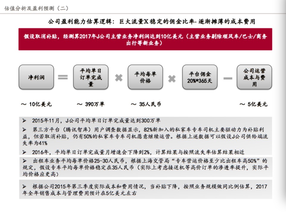 也是在36kr获得的这张PPT里,疑似为滴滴的“J公司”,用了一整张PPT来描述这样一个未来:一旦取消补贴,经测算,J公司主营业务净利润2017年将达到10亿美元。