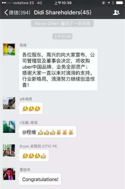 而根据36kr获得的一张滴滴股东微信群的截图。在今早10点多,滴滴和Uber中国的此次合并已经基本达成。另一个消息源则在今天日间对36kr称,这个案子将在今天晚间前最终结束。