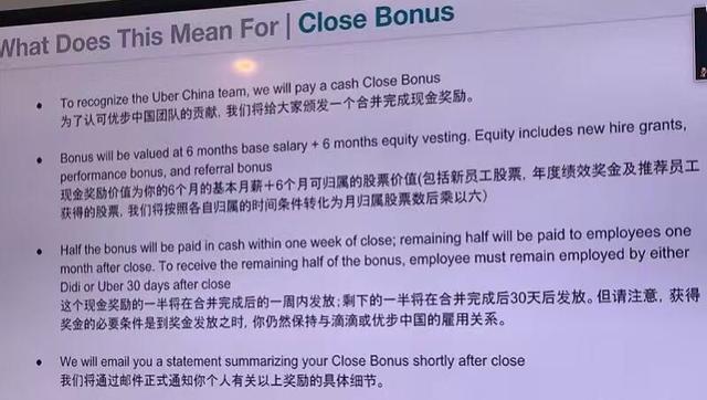 就在今日晚间,Uber全球发布邮件,称为了认可优步中国团队的贡献,我们将给大家颁发一个合并完成现金奖励。