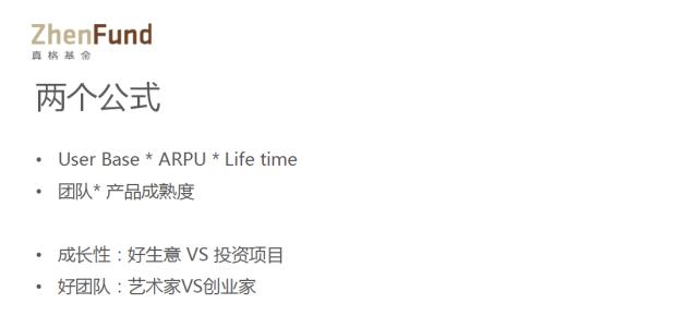 大家都会问真格基金投资有什么样的准则和心得。可能有两个公式大家会挺感觉兴趣的,一个公式,当我们看待投资项目本质的时候,我们在看什么。到最后你看一个公司的价值,你会看这个公司到底能创造多少价值,不管用户是 B 端用户还是 C 端用户,最后是用户给他贡献的。