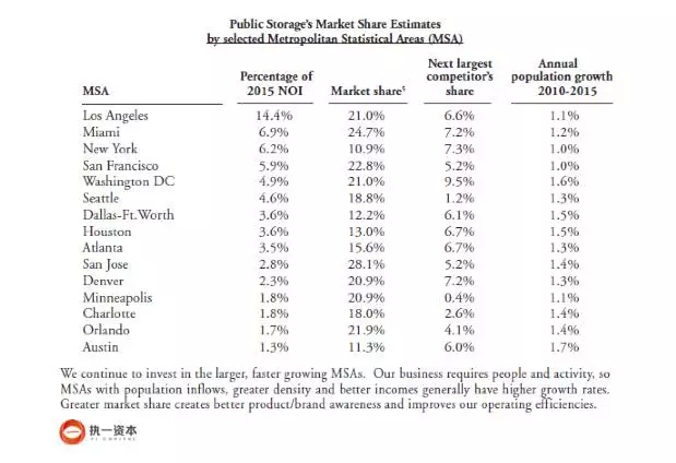 - 地域属性强:自存仓具有很强的本地属性,用户习惯把东西存在离家5英里的范围内。同时,并不是所有的城市都适合规模化的投入,成功的公司往往集中在核心城市区。Public Storage 71%的成熟店收入来自于20大MSA城市(Metropolitan Statistical Areas),并且已经在当地占领关键市场份额,是第二名的2-3倍。