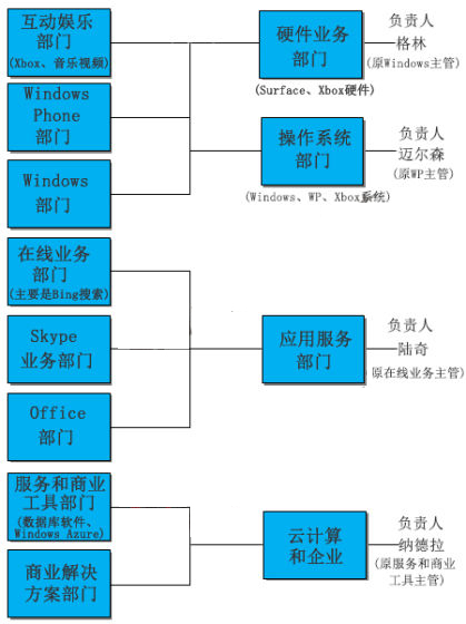 作为鲍尔默执掌CEO之后经手的微软最大一次重组,他把之前的8个产品部门重组为4个新部门:操作系统部门;硬件业务部门;应用服务部门;云计算和企业部门。