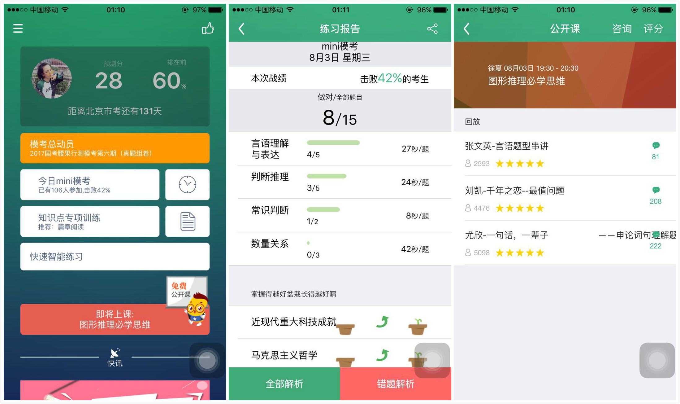 张慧邃透露,在去年的 500 万注册用户中,去年国考笔试考季的正式付费用户 3000 人左右,课程出勤率 70%-80%,大部分营收来自大课,参培后的考试通过率暂时不做透露。