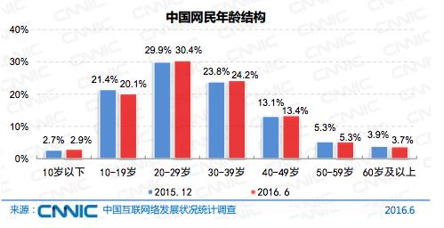网民结构中男女比例为53:47,与人口性别比例基本一致(51.2:48.8)。其中,20-29岁年龄段的网民比重最高,达30.4%;其次为30-39、10-29岁群体,比重分别为24.2%、20.1%。10-39岁群体占总网民数的74.7%,成为主力军。10岁以下及40岁以上群体比重略有增加。