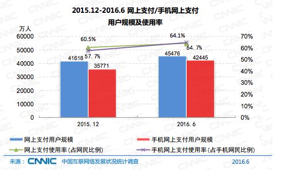 随着互联网理财市场的快速发展,网民线上理财的习惯初步养成,规模达到1.01亿,理财市场发展呈现出平台化、场景化、智能化的发展趋势。网上支付的用户规模已达到4.55亿,手机支付规模达4.24亿,但用户线下消费使用网上支付还处于习惯养成期,这也成为各大支付企业的必争之地。
