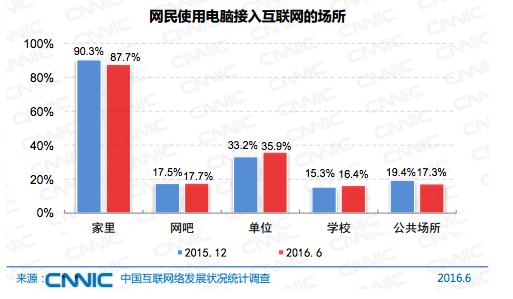 在使用场所与上网时长方面,近半年中国网民在家上网的比例下降了2.6%,为87.7%,在单位、学校、网吧上网的比重稍有上升。人均周上网时长为26.5小时,比2015年提高0.3小时。