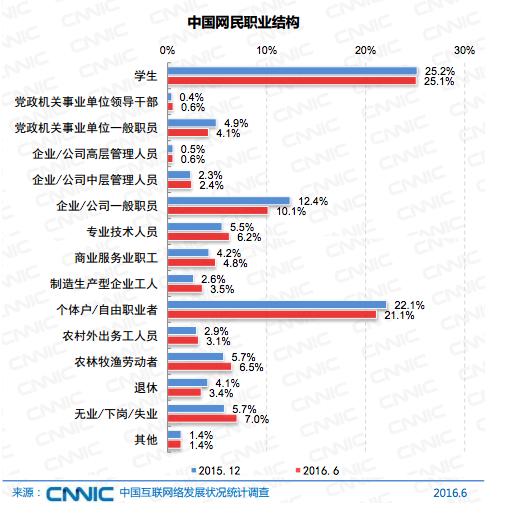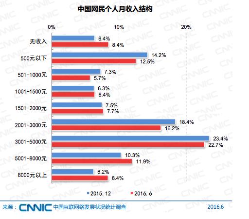 从职业及收入角度看,学生及自由职业者比重最高,分别占25.1%、21.1%,其次为企业管理人员及职工,达13.1%。这三类群体比重较为稳定,占总比重的56.3%。网民收入中最高的群体为2001-3000元及3001-5000元,分别占比16.2%和22.7%,值得指出的是,较2015年底,收入在5000元以上的网民群体占比提高了3.8%,网民整体收入水平逐年增长。