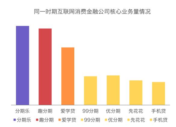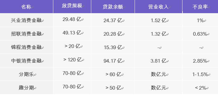 分期乐与趣分期这两家公司行业领导者随着在校园市场的地位巩固,以及在校外人群的延伸,其贷款规模与贷款余额已经超过部分银行系控股的消费金融公司,接近中银这样的持牌老公司。