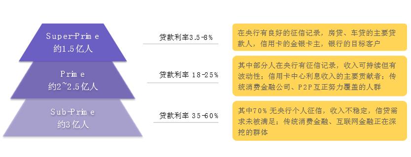 金融机构在个人信贷领域,按照贷款用户的质量分为三大层级:分别是 Super Prime(优质客户)、Prime (勉强符合标准客户)、Sub-Prime(次级客户);不同层级的客户,获批的贷款类型不同,金融机构的风险定价也不同。
