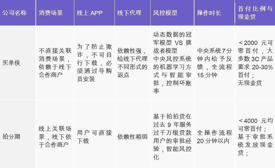 70%蓝领群体没有央行个人征信,因而信用卡中心等传统金融机构的渗透率不高于15%;互联网消费金融公司认为这是一蓝海机遇,代表公司有买单侠、即有分期、拍分期等,其中买单侠与拍分期的业务模式差别最为明显,以这两者为例: