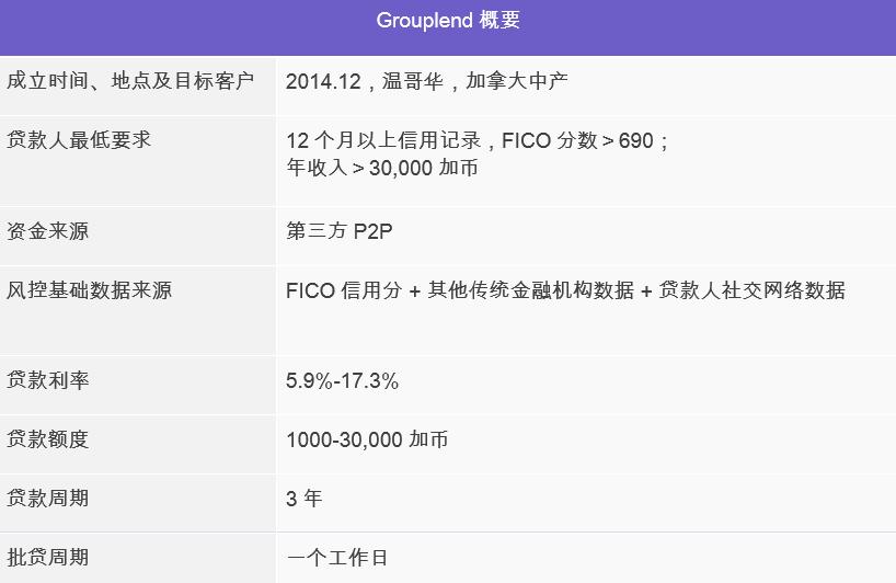 Grouplend 于 2014 年在加拿大温哥华成立,主要为加拿大中等收入人群提供消费信贷服务,其服务特色在于:Grouplend 会参照贷款用户的社交信息数据,做出是否放贷、 放贷利率高低的决策;社交信息包括社交活跃度、社交关系、好友的平均信用等级等。举例而言:如果贷款者好友的平均信用等级没能达到其规定的最低信用分要求,或者贷款者的好友违约率过高,都会使得 Grouplend 拒绝该名申请者的贷款请求或将贷款的利息相应提高。