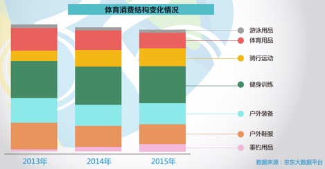 从2013-2015年的消费轨迹来看,基础性的体育用品消费比重呈现出明显下降的态势,这背后反映出体育消费升级的现状。同时,骑行运动、游泳、垂钓等专业性较高的运动,在京东用户的消费中所占比重一路上行,其中尤以垂钓用品、骑行运动的消费增速最快,可见满足特定人群的“小众”运动项目,正逐渐成为热潮。