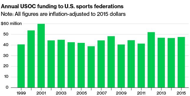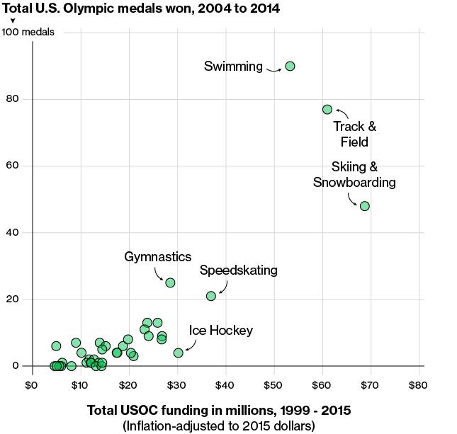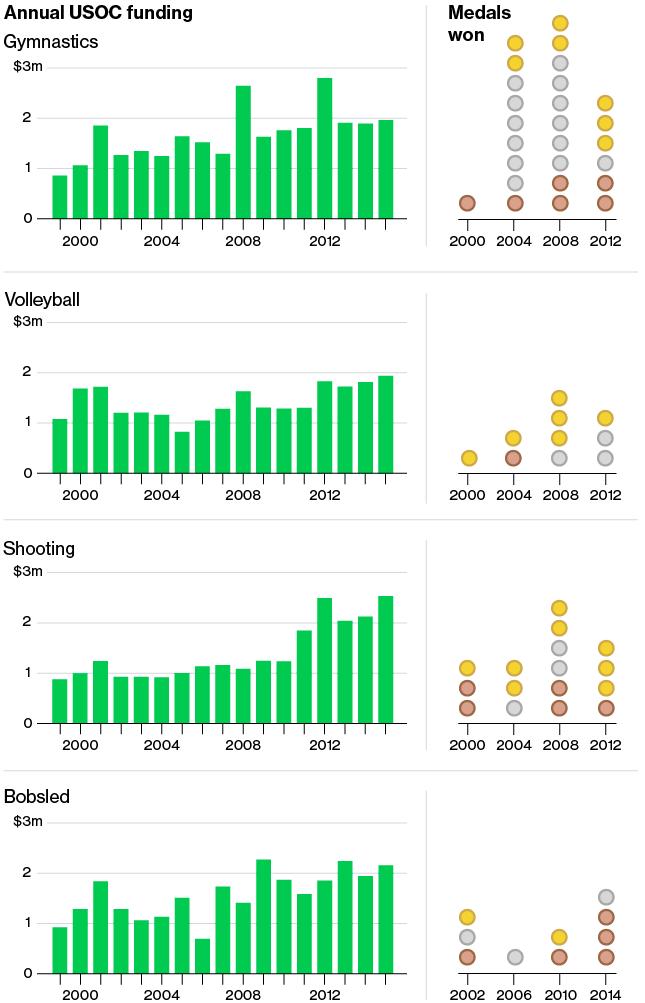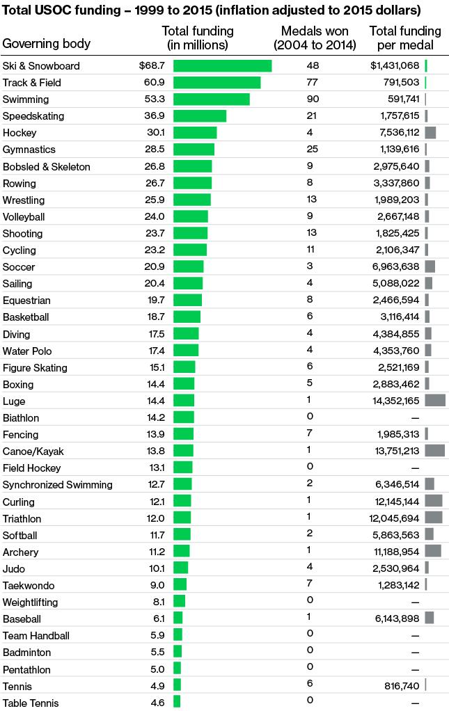 2004年以后,美国代表团获奖最多的奥运项目:游泳、田径、冰雪运动、体操和速度滑冰,从美国奥委会得到了最多的资金支持,总共大约为2.48亿美元。不管是更多的资金支持赢得了更多的奖牌,还是更多的奖牌让它们获得了更多的资金支持,它们之间的联系总归是很强的。