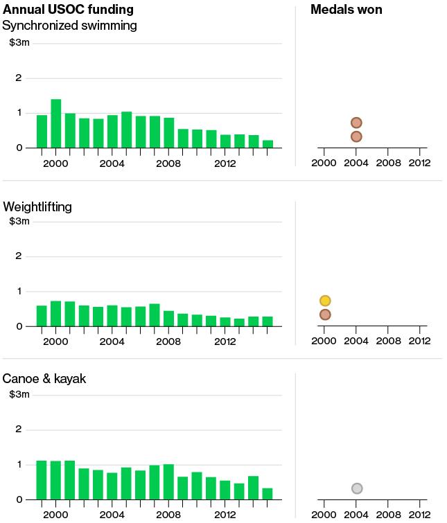 在前两个奥运周期里,花样游泳、举重和皮划艇没有得到过一枚奖牌,美国奥委会也随之减少了对这些项目的资金支持。其中花样游泳项目2015年得到的投入资金降到了近17年的最低值。幸运的是,尽管面临着俄罗斯和中国的双重竞争Anita Alvarez和Mariya Korleva还是为美国花样游泳女双项目在这届奥运会保留了一定的悬念。但美国花样游泳集体项目并没有获得此次奥运会的参赛资格。