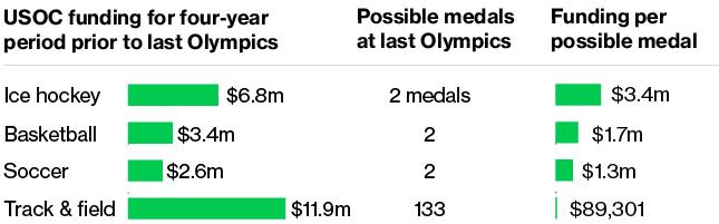 因为有很多单项的比赛,田径和游泳有机会赢得更多的奖牌。因此,美国奥委会对这两项的资金支持似乎成了一笔性价比很高的投资。但是像冰球、足球和篮球这样的团体项目同样能够得到大笔钱,而且通常情况下女子团体项目比男子团体项目获得的资金支持要多。比如说美国男篮夺冠的概率并不会因为你是否为他提供足够的资金支持而改变,因为他们本身就已经很富有了而且赞助商一般也会为他们提供奥运会期间的花销。但对于职业化程度不那么高的女子团体运动项目的发展或许更多的还得依靠奥委会的资金支持。即使最后的结果可能是只获得一枚团体奖牌,但仍然要花费一大笔钱来保障这20人的队伍参加比赛,因为这些比赛是受美国人关注的热门项目。