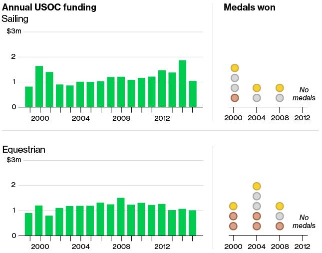 在之前连续三届奥运会收获奖牌后,美国帆船队和马术队在伦敦奥运会上遭遇滑铁卢。这两项运动都需要很大的投入,因为维护帆船和照顾马匹都需要花很多钱。美国过去在这两个项目上一直表现不错,因此获得了持续稳定的投入。但美国奥委会在去年已经减少了对这两个项目的投入,并且有可能今年还这样做,最终的结果取决于它们在里约奥运会上成绩。